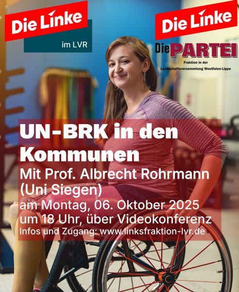 Veranstaltung über Videokonferenz organisiert durch Die Linke in der Landschaftsversammlung Rheinland (LVR) und Die Fraktion DIE LINKE. Die PARTEI im Landschaftsverband Westfalen-Lippe (LWL) am Montag, 6. Oktober 2025, ab 18 Uhr, über Videokonferenz Seit 2009 ist die UN-Behindertenrechtskonvention (UN-BRK) in Deutschland geltendes Recht. Laut dieser Konvention sollten alle staatlichen…